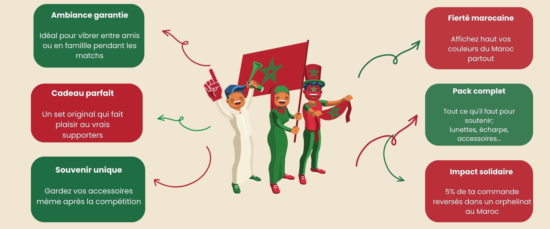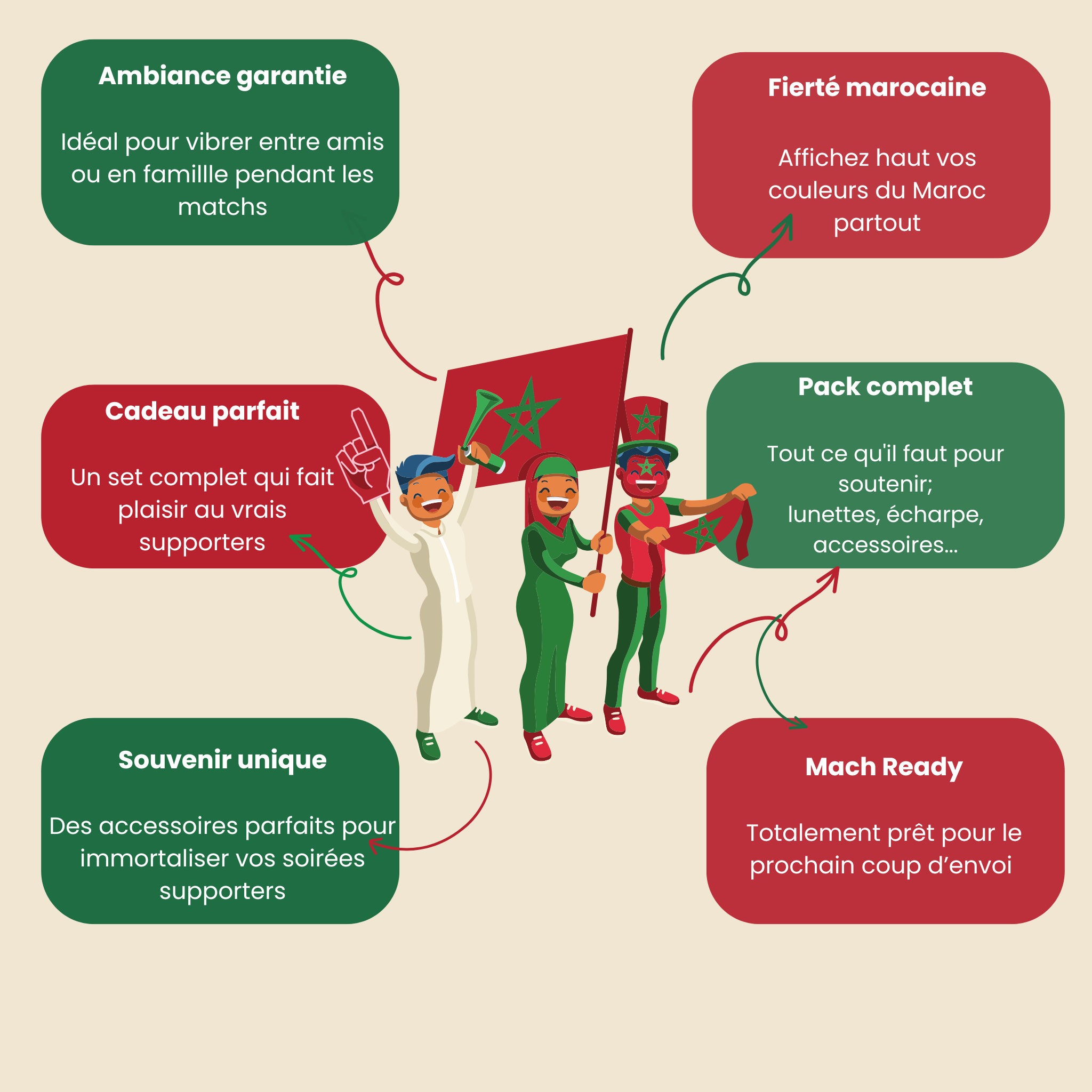 Notre pack est pensé pour tous les supporters du Maroc 🇲🇦 : familles, amis, couples ou groupes de supporters.