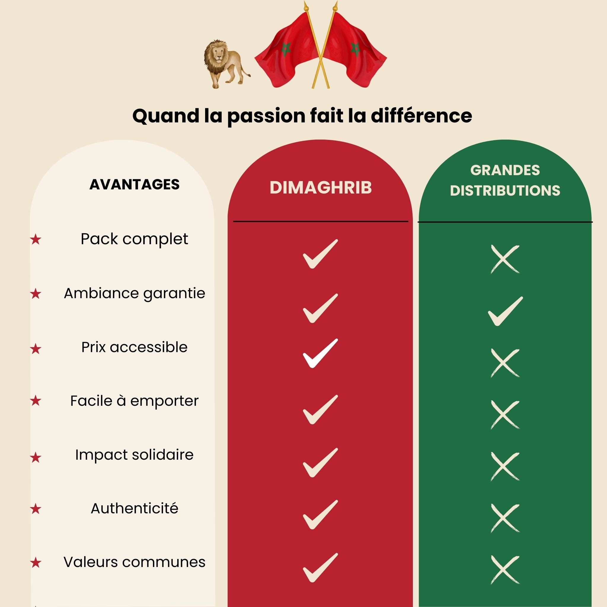 Que ce soit pour encourager les Lions de l’Atlas, célébrer une fête, un mariage ou simplement montrer votre amour pour le Maroc, le pack Dima Maghrib est fait pour vous.